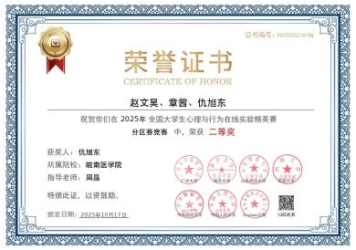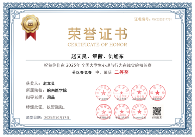自本届大赛启动以来,选手们通过专业知识认证,培训备赛,细心打磨作品。应用心理学教研室邀请了多位专家举行了校内评审,“心理•丝阔特”团队以校内第一名的成绩进入东部区赛。在东部区赛中,“心理•丝阔特”团队凭借严谨的实验设计与扎实的数据分析能力,围绕现实心理问题提出创新性研究假设,展现出良好的学术素养与团队协作精神。经过激烈角逐,其研究成果获得评审专家高度认可,最终荣获东部区赛二等奖,为公司和公司争得荣誉,也为后续全国决赛积累了宝贵经验。