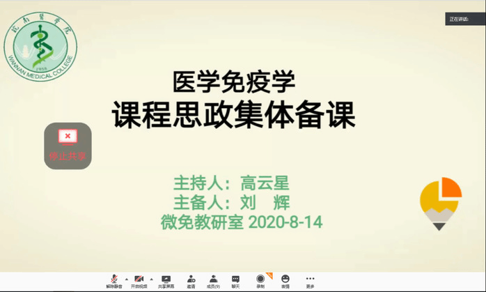 抗疫背景下,为贯彻落实公司“课程思政教育思想大讨论”活动的相关工作要求,按照公司统一部署,8月14日,医学微生物学与免疫学教研室托腾讯会议平台,组织教研室全体教师开展了一次“医学免疫学课程思政”线上集体备课活动。本次集体备课由教研室主任刘辉老师主备,教研室党支部书记高云星老师主持,邀请了公司有关领导、督导组专家成员和相关教研室教师代表参加。