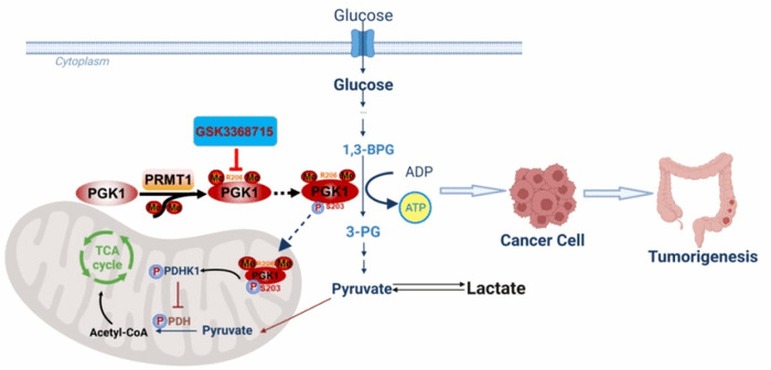 蛋白质精氨酸甲基化修饰在癌症恶性进展中有重要作用,PRMT1是精氨酸甲基转移酶家族蛋白的重要成员之一,PRMT1是否能调控结直肠癌细胞糖代谢进程,目前尚未有明确报道。该研究首先发现PRMT1能通过增强结直肠癌细胞的糖酵解功能来促进细胞增殖与肿瘤发展。随后运用质谱检测、甲基化实验和PGK1蛋白空间结构位点分析等方法,发现PRMT1直接催化PGK1的R206位点发生非对称性二甲基化修饰(meR206-PGK1),甲基化修饰的PGK1促进ERK对PGK1的S203位点进行磷酸化修饰,从而促使PGK1易位入线粒体并抑制PDHA的磷酸化,导致三羧酸循环障碍而抑制了线粒体功能,从而促进癌细胞糖酵解功能。该研究还阐明meR206-PGK1的表达和结直肠癌患者的恶性程度以及不良预后均呈正相关性。