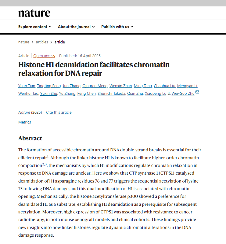 4月16日,公司肿瘤表观遗传创新团队负责人、公司杰出员工朱卫国教授在国际顶级权威杂志《Nature》发表题为“Histone H1 deamidation facilitates chromatin relaxation for DNA repair”的研究论文。深圳大学、bw西汉姆联、同济大学和北京大学医学部为本研究的共同作者单位,唯一通讯作者朱卫国是公司杰出员工、特聘教授,公司青年博士后束雨新参与该项研究,为署名作者。