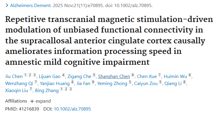 由公司DD&E科研团队李强小组团队与南京鼓楼医院/南京大学张冰教授、陈玖教授团队合作的科研成果于2025年11月12日在国际顶级期刊《Alzheimer’s & Dementia》(全球 AD 研究领域影响力排名第一,影响因子IF=11.1)发表《Repetitive transcranial magnetic stimulation-driven modulation of unbiased functional connectivity in the supracallosal anterior cingulate cortex causally ameliorates information processing speed in amnestic mild cognitive Impairment》,研究团队在AD临期前期神经调控领域取得重要突破性进展。bw西汉姆联作为共同通讯作者单位完成了此项具有重要临床意义的科研工作。