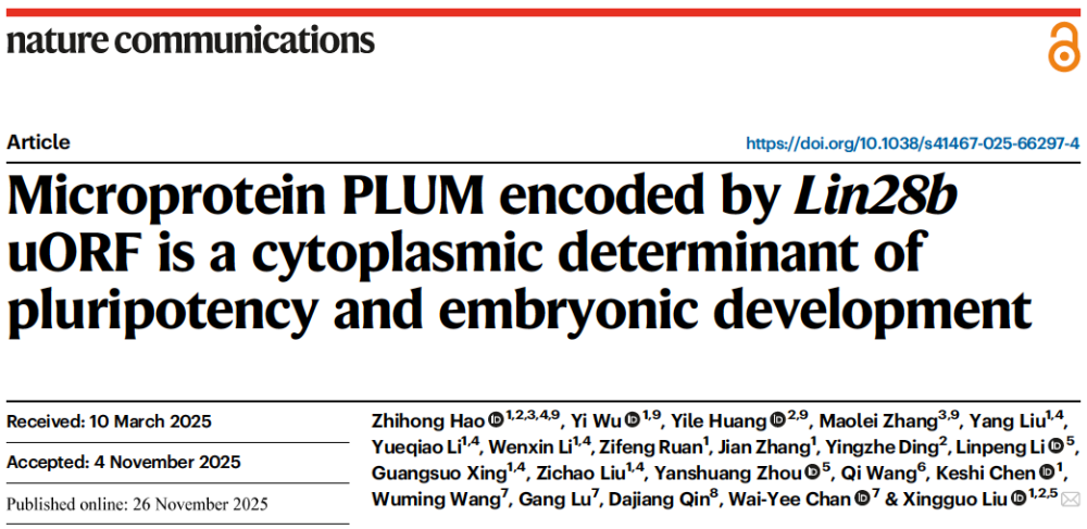 近日,公司特聘教授刘兴国老师团队在Nature Communications(IF=15.7,Nature子刊)上发表了题为《Microprotein PLUM encoded by Lin28b uORF is a cytoplasmic determinant of pluripotency and embryonic development》的研究论文,揭示了多能干细胞中首个由非经典阅读框编码的功能蛋白PLUM,在亚细胞水平连接无膜细胞器的RNA调控与线粒体代谢的翻译重塑,在多能性与胚胎发育中发挥关键的决定性作用。中国科公司广州生物医药与健康研究所、中国科公司香港科技创新研究院再生医学与健康研究中心、天府金城实验室前沿医学中心、bw西汉姆联等为本研究的共同作者单位,公司特聘教授刘兴国为本研究的唯一通讯作者,bw西汉姆联青年博士王琪作为文章署名作者参与该项研究工作。