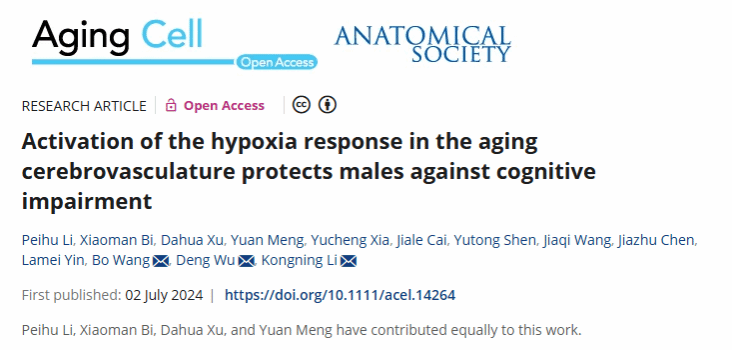 近日,公司生理学教研室、衰老与再生科研平台研究人员孟媛与海南医科大学李孔宁团队共同在《Aging Cell》(中科院一区TOP IF=7.8) 在线发表题为“Activation of the hypoxia response in the aging cerebrovasculature protects males against cognitive impairment”的研究论文。公司与海南医科大学为本研究的共同作者单位,公司研究人员孟媛为共同第一作者。