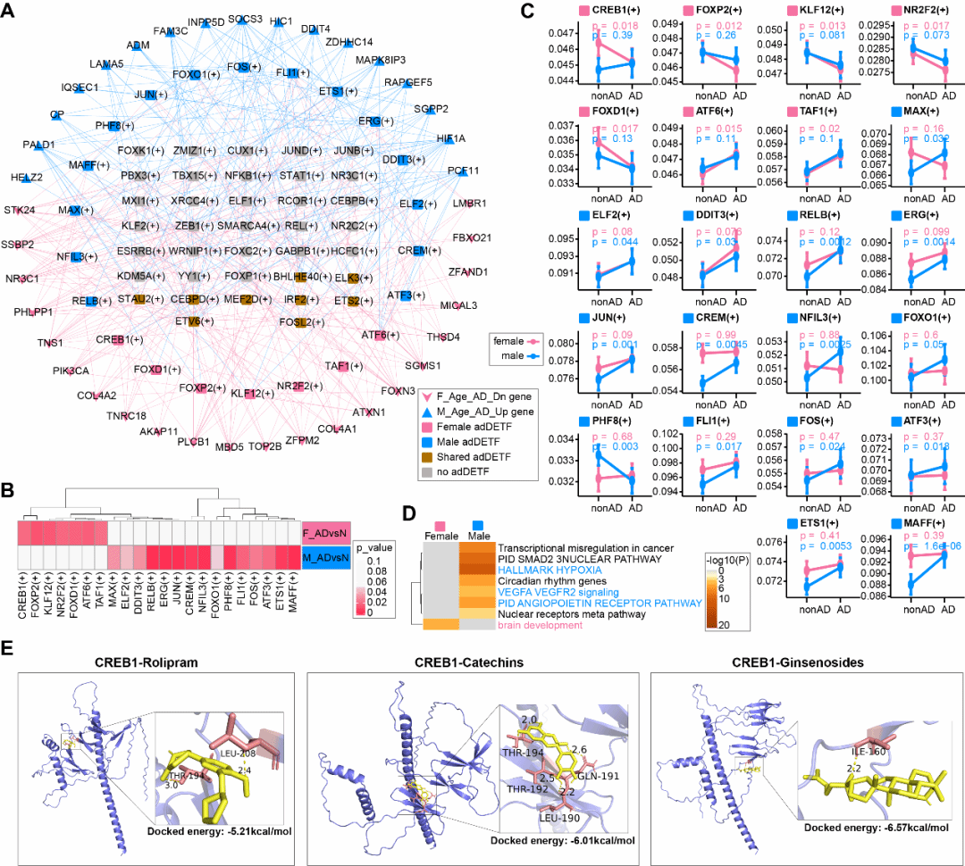 在机制方面,该文研究发现,在阿尔茨海默症(AD)早期阶段,男性出现显著增加的缺氧反应特征,而女性则表现出显著的抗原表达特征。与缺氧密切相关的通路如EGF/EGFR信号通路和生长因子刺激的细胞反应在男性AD早期显著增加,尽管在疾病晚期持续增加,但显著性有所下降。该研究提出,女性在正常衰老过程中,由于激素特异性变化抑制了低氧应答,导致血管生成功能障碍。已有研究表明,雌激素能够通过非基因组机制快速磷酸化CREB,而磷酸化的CREB能够正向调控VEGF来促进血管生成,从而影响氧气灌注并损害认知功能。基于此,课题组搜集了目前已发现的靶向CREB的药物,包括咯利普兰(rolipram)、儿茶素(Catechins)、人参皂苷(Ginsenoside)。通过分子对接实验,他们发现这三种化合物可以稳定地与CREB1结合,具有作为治疗女性AD的潜力。(孟媛/文、图)