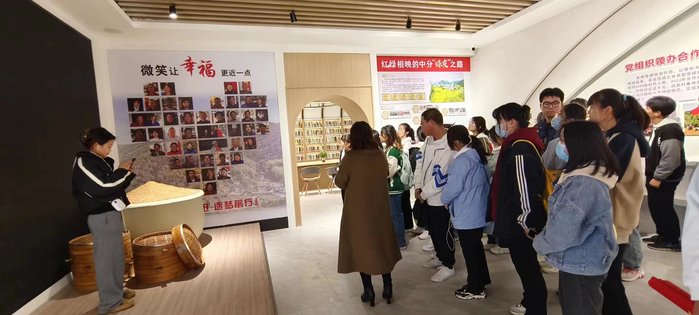 随后,在村党总支书记苏清芬的带领下,师生一行来到中分村红色学堂,了解党建引领乡村振兴工作在中分村取得的巨大成就。一张张纪实的照片和一个个喜悦的笑脸,充分彰显了乡村振兴为人民群众带来的获得感和幸福感,自豪感也在每一位师生心中升起,大家自豪于生在如此辉煌的时代,有着伟大和开明中国共产党的领导。