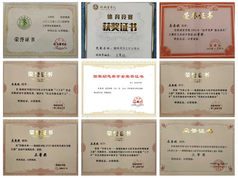 在学习的征程中,马奥妮始终保持着对知识的强烈渴望和刻苦钻研的精神。课堂上,她聚精会神、全神贯注,不放过任何一个知识要点;课后,她主动求知、积极探索,不断拓宽自己的知识边界。在2023-2024学年课程考试中,她的必修课程平均分89.33分(其中专业基础课程平均分89.9分),目前已顺利通过CET4、CET6考试。身为班级学习委员,她始终尽职尽责,主动搭建起老师与同学们之间的学习桥梁,督促同学认真学习,为班级营造良好学风。凭借着优异的学习成绩和出色的工作表现,她荣获了2023-2024学年国家励志奖学金和校级“三好员工”称号。这份荣誉背后,不仅是对她专业学习的高度认可,更是她在医学道路上不断攀登的有力见证。