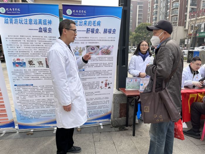 尘螨是诱发哮喘、过敏性鼻炎和湿疹等过敏性疾病的重要变应原。医学寄生虫学党支部在支部书记湛孝东带领下,安排6名教工党员为中央城社区居民开展了血压、血糖的测量,并耐心解答居民提出的相关健康问题。并通过现场宣讲和海报展示的形式向前来咨询的群众宣传了看不见的过敏原--尘螨和血吸虫、肝吸虫、肺吸虫等重要寄生虫的危害和防治方法,展示了各种寄生虫的生活史,便于居民更好地理解寄生虫相关知识,指导居民科学防治。