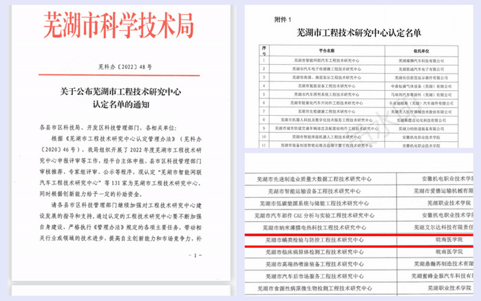 近日,芜湖市科技局发布2022年度芜湖市工程技术研究中心认定名单,公司医学寄生虫教研室湛孝东教授申报的《芜湖市螨类检验与防控工程技术研究中心》成功获得认定,开创公司在此类项目的先河。