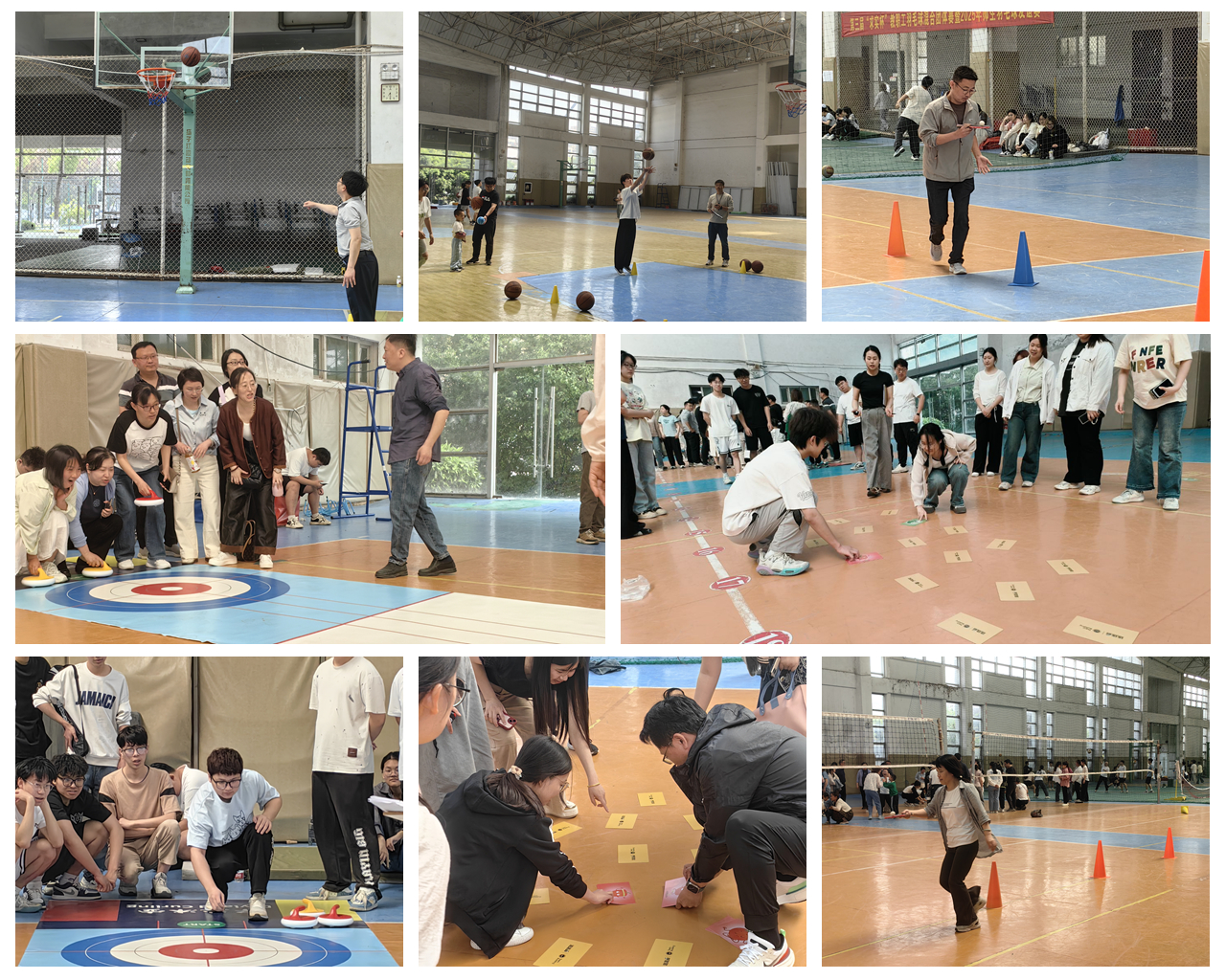 集体项目“旱地冰壶”将传统冰壶运动的竞技智慧与趣味性巧妙融合,每队成员明确分工、默契配合,有人负责精准投壶,有人观察局势、制定战术,还有人指挥队友通过擦地控制冰壶滑行轨迹和速度,现场充满竞技智慧和趣味性。“果蔬连连看”是将经典游戏与运动场景相结合的创新尝试,参赛者需在规定时间内,通过接力的方式,快速找到放置在场地中的相同果蔬道具并配对成功。过程中,队员们全神贯注寻找果蔬,动作滑稽有趣,围观师生加油助威、出谋划策,互动频繁。“拔河比赛”项目成为全场焦点,教师队与员工队展开力量对决,双方紧握长绳、重心后倾,围观师生组成“啦啦队”呐喊助威,把趣味运动会气氛推向高潮。